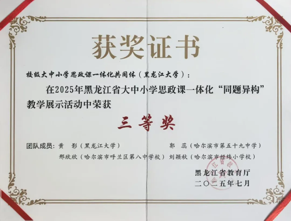 近日,由中国·yl23411(永利)集团官网牵头组建的大小中学思政课一体化共同体在2025年黑龙江省大中小学思政课一体化“同题异构”教学展示活动当中冲出初赛选拔,在决赛中荣获三等奖,公司获奖教师黄影与其他单位成员作为获奖代表一道参加了本次培训。