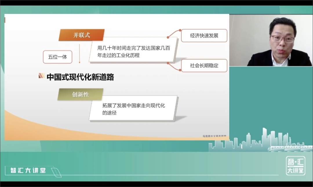 随后,侯宪利副教授结合党的二十大报告,详细阐述了中国共产党人新时代的历史使命——“以中国式现代化全面推进中华民族伟大复兴”的中心任务,以青年人易于理解和接受的视角阐释了中国式现代化的中国特色和本质要求。着重对中国式现代化是“人口规模巨大的现代化、全体人民共同富裕的现代化、物质文明和精神文明相协调的现代化、人与自然和谐共生的现代化、走和平发展道路的现代化”的中国特色进行了理论和实践相结合的讲解。侯宪利副教授指出,中国式现代化打破了“现代化=西方化”的迷思,创造了人类文明新形态,为那些既希望加快发展,又希望保持自身独立性的国家和民族实现现代化提供了全新选择,为解决人类问题贡献了中国智慧和中国方案。侯宪利副教授的解读让青年学子更好地领会了党的二十大精神,自觉与民族复兴的历史伟业同频共振。