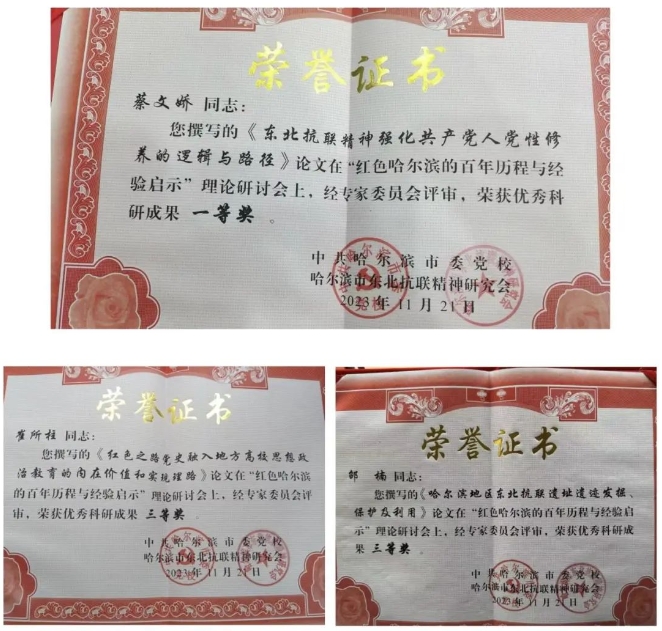 在红色哈尔滨的百年历程与经验启示理论研讨会上,哈尔滨市东北抗联精神研究会会长李天明宣布了研讨会征文获奖名单。学院中共党史党建学专业研究生蔡文娇撰写的《东北抗联精神强化共产党人党性修养的逻辑与路径》获得优秀科研成果一等奖;思想政治教育专业研究生崔所柱撰写的《红色之路党史融入地方高校思想政治教育的内在价值和实现理路》、邵楠撰写的《哈尔滨地区东北抗联遗址遗迹发掘、保护及利用》获得优秀科研成果三等奖。