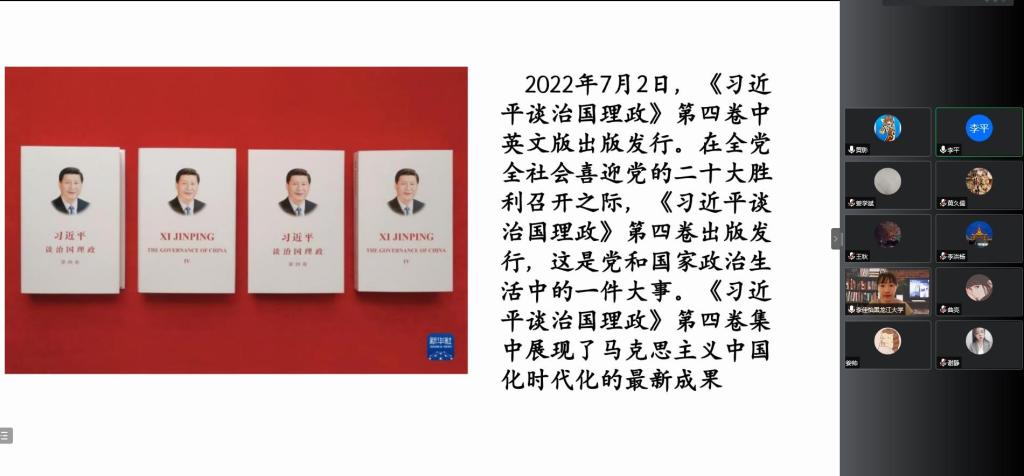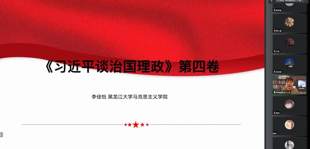 教研部副主任李佳怡老师对《习近平谈治国理政》第四卷内容进行细致的解读。李佳怡老师认为,《习近平谈治国理政》第四卷集中展现了马克思主义中国化时代化的最新成果,深刻反映出习近平新时代中国特色社会主义思想是当代中国马克思主义、21世纪马克思主义,是中华文化和中国精神的时代精华,是确保党长期执政和国家长治久安的思想旗帜,是新的历史起点上坚持和发展中国特色社会主义的根本指针,是实现中华民族伟大复兴的行动指南,充分体现了我们党对构建人类命运共同体、共建美好世界的最新贡献,是与第一卷、第二卷、第三卷一脉相承、全面系统反映习近平新时代中国特色社会主义思想开辟新境界、实现新飞跃的权威著作,进一步科学回答了中国之问、世界之问、人民之问、时代之问,对于推动党员深入学习贯彻习近平新时代中国特色社会主义思想,进一步加深对中国之路、中国之治、中国之理的理解,坚决拥护“两个确立”、做到“两个维护”,在新时代新征程上团结奋斗、勇毅前行,具有重大而深远历史意义和现实意义。