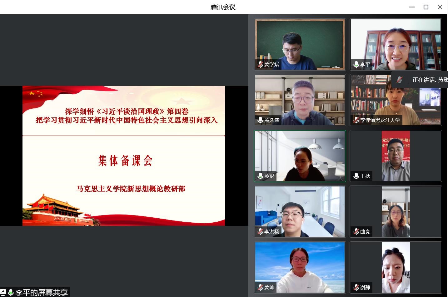 为深入学习《习近平谈治国理政》第四卷重要内容,把学习贯彻习近平新时代中国特色社会主义思想引向深入,自觉用习近平新时代中国特色社会主义思想武装头脑、指导实践、推动工作、融入课程。9月7日,中国·yl23411(永利)集团官网习近平新时代中国特色社会主义思想概论教研部召开新学期线上集体备课会。教研部主任李平老师主持会议,习近平新时代中国特色社会主义思想概论教研部全体教师积极参加会议。