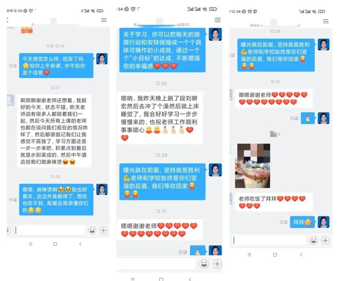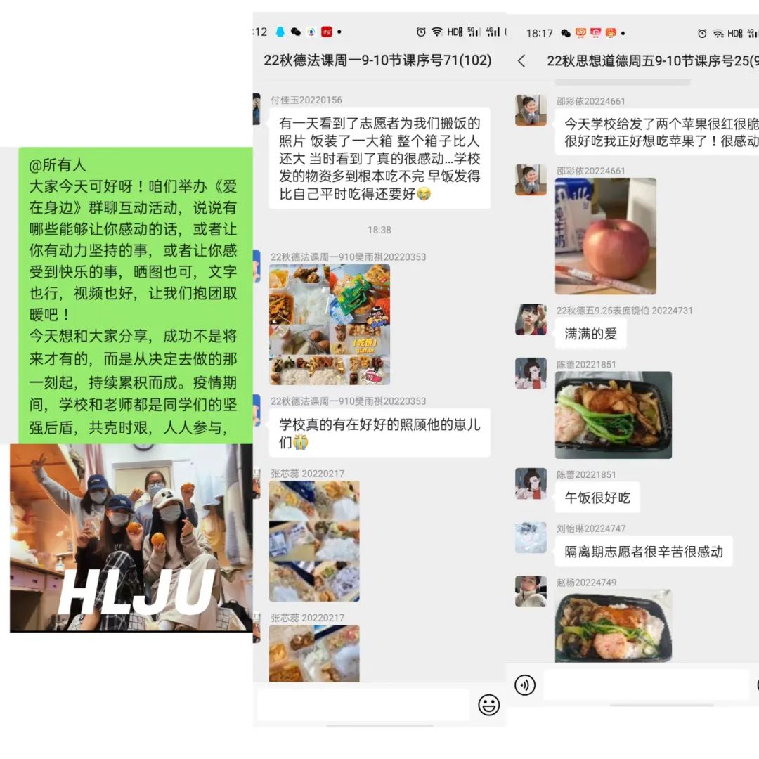 处在教学一线的思政课教师们也从未间断对员工们的关爱。教工第二党支部书记李国杨老师在课上跟同学们表示任何问题都可以随时联系她。其中一个原住C16寝室楼、现在宾馆隔离的员工情绪不太稳定,李老师一直跟这个员工保持信息沟通,不断开导劝说给员工鼓励和关心。教工第三党支部书记谷真研老师每日在班级群里与员工们交流沟通,举办“爱在身边”群聊互动活动,让同学们分享感动的话、有动力坚持的事、感受到快乐幸福的瞬间等等。马克思主义基本原理教研部邹天琦老师在面对所任教班级同学的求助时,第一时间响应,在思想政治教育教研部的秦泗岩老师支持下,帮助这名同学解决了目前的问题,排解了焦虑情绪。思想政治教育教研部赵瑛琪老师在课堂上,以本次疫情防控身边的点滴为例,引导同学们感受困难面前人与人之间的温暖,正确认识社会主义核心价值观所倡导的“友善”。同时,她也向同学们分享了自己的隔离经历,鼓励同学们调整好心态,在房间内适当加强体育运动,保持身心愉悦。