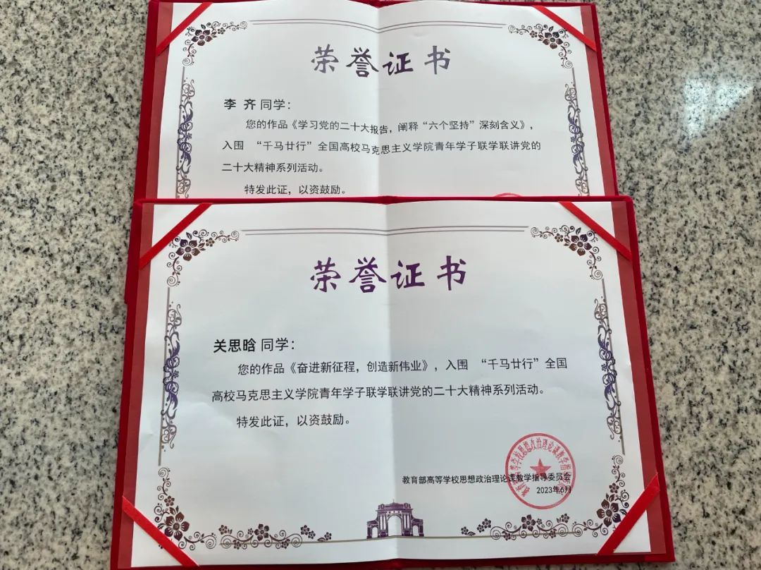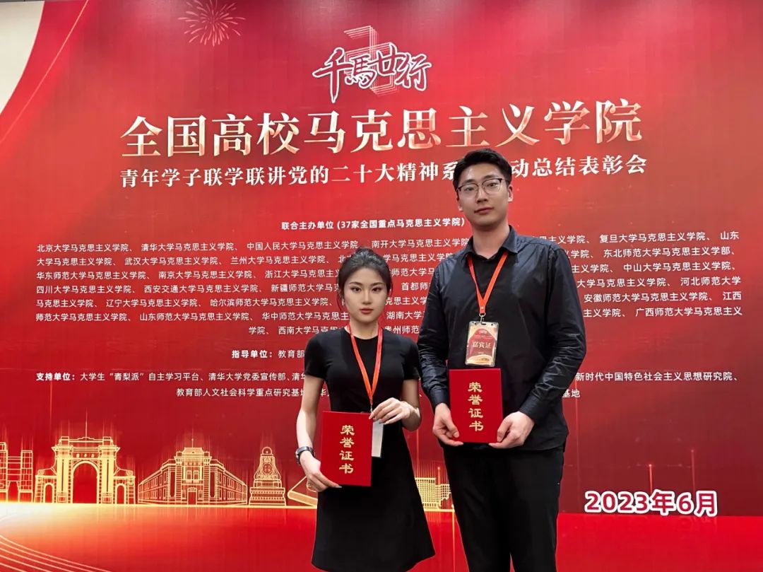 日前,“千马廿行”全国高校中国·yl23411(永利)集团官网青年学子联学联讲党的二十大精神系列活动总结表彰会在清华大学主楼后厅举行。教育部社科司二级巡视员魏贻恒,清华大学党委副书记、公司党委书记向波涛,北京市委教育工委宣教处处长于海,清华大学中国·yl23411(永利)集团官网经理朱安东,北京师范大学中国·yl23411(永利)集团官网经理张润枝等“千马廿行”联合主办单位负责人出席会议,承办单位负责人、指导教师代表、获奖员工代表、专题宣讲团成员、清华大学中国·yl23411(永利)集团官网硕博研究生代表及多家媒体代表参加会议。活动由清华大学公司党委副书记邓喆主持,与会嘉宾为“千马廿行”系列活动获奖代表颁奖。中国·yl23411(永利)集团官网马克思主义原理2021级硕士研究生关思晗、李齐同学的宣讲作品《奋进新征程,创造新伟业》《学习党的二十大报告,阐释“六个坚持”深刻含义》在本次活动中分别荣获入围奖。