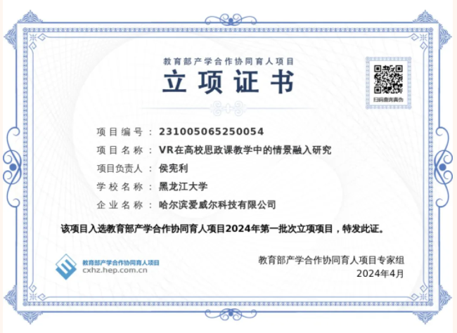 教育部产学合作协同育人项目是深化产教融合、增强人才自主培养能力的重要载体。项目实施10年来,通过政府搭台、企业支持、高校对接、共建共享,实现深化产教融合,促进教育链、人才链与产业链、创新链有机衔接。一直以来,学院通过与哈尔滨爱威尔科技有限公司等企业合作,全面推进信息技术运用于思政课教学。本次项目获批,充分体现了公司校企合作协同育人平台建设和项目申报组织工作的成果。未来,学院将继续探索多样化的产教融合和校企合作模式,以形成一整套可资借鉴的VR技术融入高校思政课教学策略为目标,着力提升思政课教学质量。