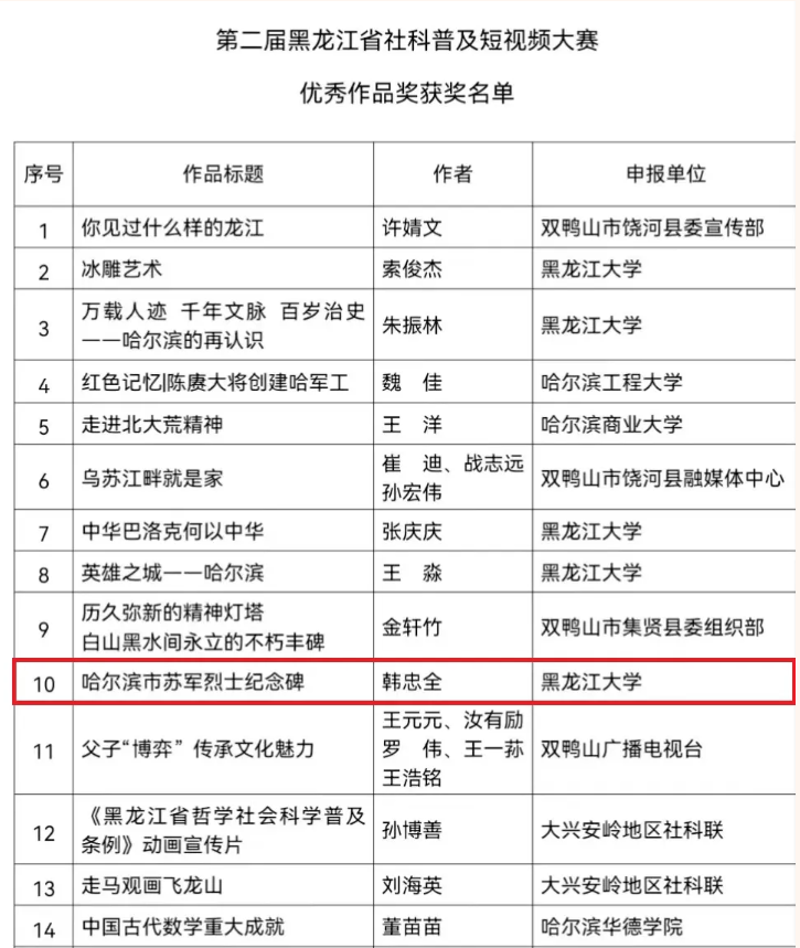 为进一步学习贯彻党的二十大和党的二十届三中全会精神,深入贯彻落实习近平文化思想,贯彻落实习近平总书记对学校思政课建设作出的重要指示精神,按照黑龙江省社科联《关于举办第二届黑龙江省社科普及短视频大赛的通知》要求,中国·yl23411(永利)集团官网通过教师自主申报、学院助力把关,选派韩忠全副教授参赛。最终,韩忠全荣获第二届黑龙江省社科普及短视频大赛优秀作品奖!