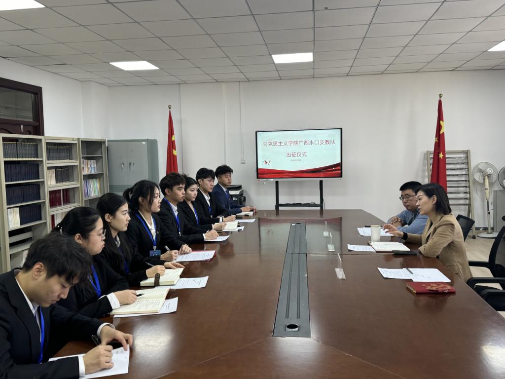 支教队队长刘欣竹在发言中表示,此次支教不仅是一次为当地孩子们传递知识的旅程,更是一次自我提升、自我锻炼的宝贵机会,她号召全体队员用青春和汗水展示马院学子的良好精神风貌,用实际行动为新时代的乡村教育事业贡献自己的青春力量。