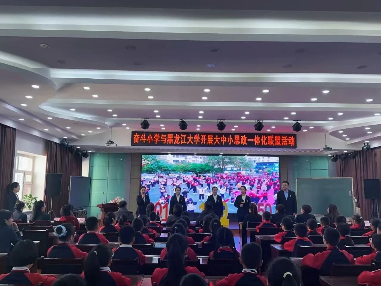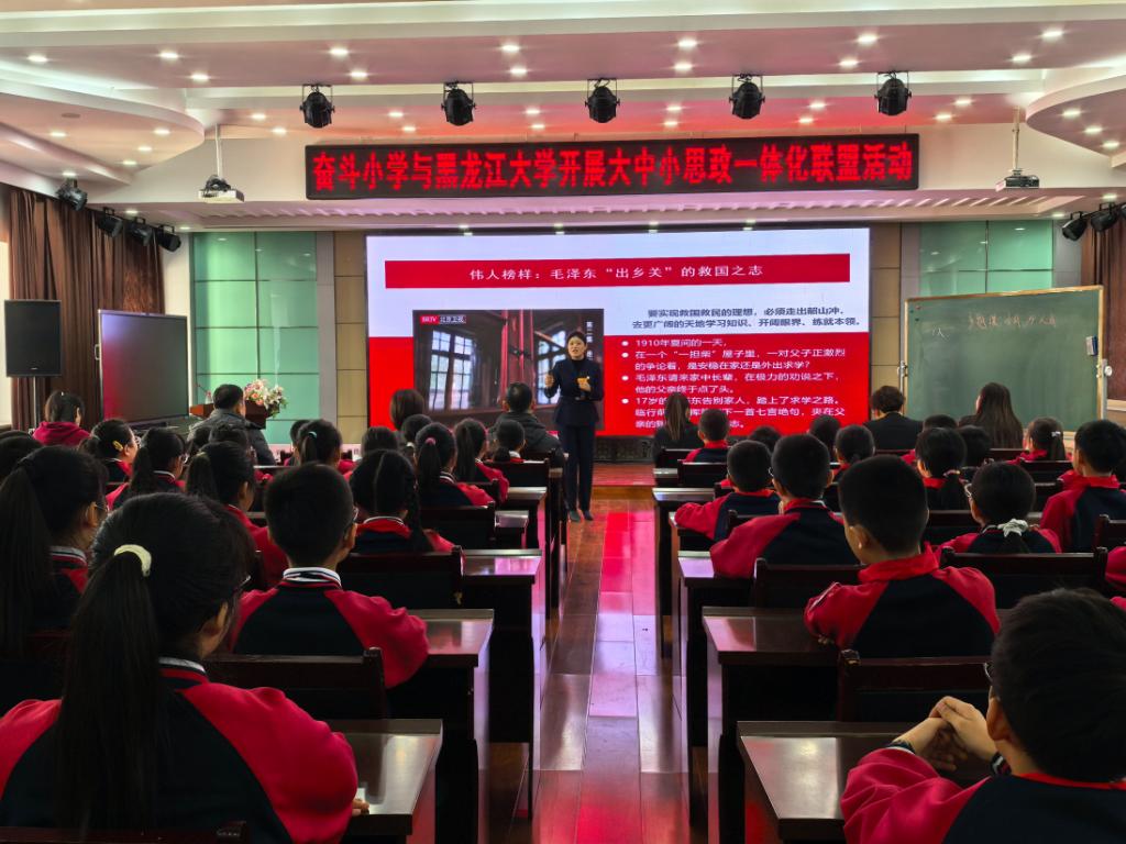 活动中,奋斗小学教师代表带来主题朗诵,回溯“奋斗”校名背后的红色基因与教育初心,用铿锵话语诠释教育工作者的赤诚与担当。公司青年思政教师李美微以《以“小我”微光 点亮“大我”星河》为题带来思政示范课,课程紧扣小员工认知规律,创新采用阶梯式育人框架,结合红色故事与龙江本土榜样事迹,将“小我成长、家国担当、人类情怀”的核心要义层层递进阐释。