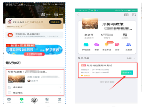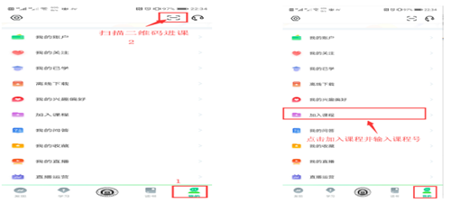 1.参加补考的同学打开并登录“知到”APP,在APP平台“我的”右上部扫描课程二维码进课,或者点加入课程,输入课程号进入课堂: