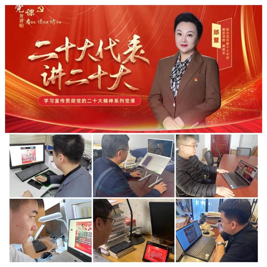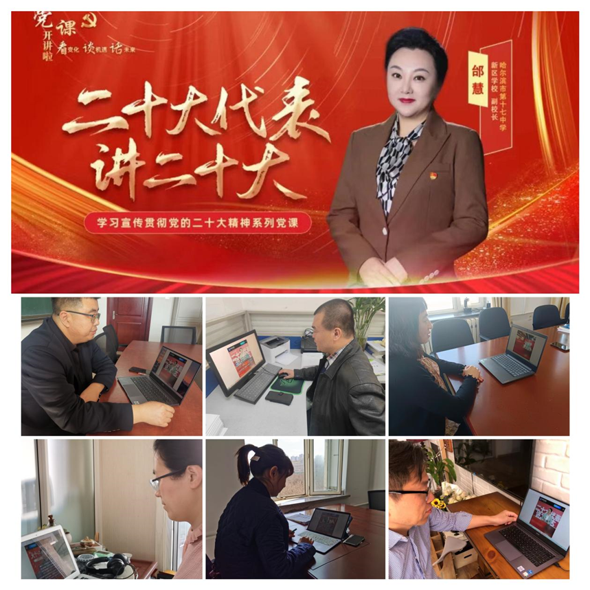 立德树人守初心,三尺讲台担使命。哈尔滨市第十七中学新区学校副董事长邰慧是黑龙江省出席党的二十大代表中,唯一一位来自基础教育战线的教育工作者。从教三十年,邰慧深爱着教育事业和自己的员工,正是这份执着的爱成就了她的教育梦想。当战“疫”的警报再次拉响后,邰慧第一个报名请战,带队立即投入到驻区高校的包保下沉防疫工作中。“咱们的这些党员代表真的都是一本本鲜活的教科书,就是孩子们的榜样”,她亲自参与学校教师团队创建、课程体系建设等工作,研发《百位人物》校本课程,邀请劳模工匠走进课堂,用实际行动践行自己的教育梦。
