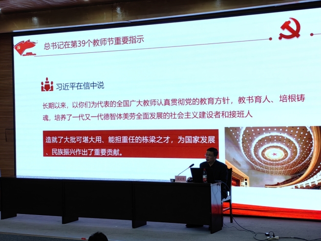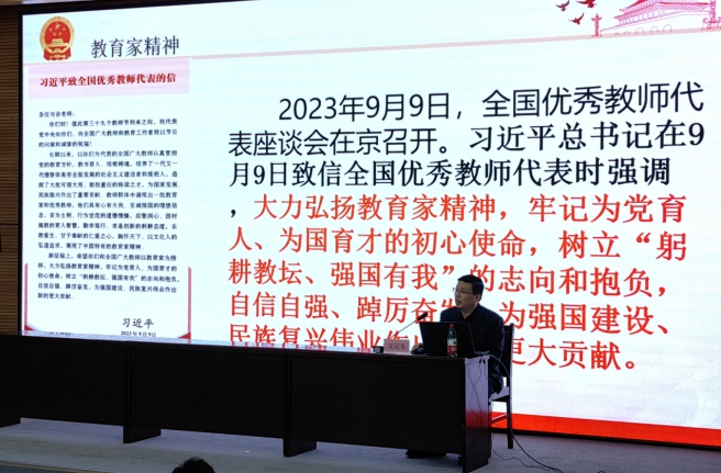随后,文记东围绕理解教育家精神核心要义、大力弘扬教育家精神、为强国建设民族复兴伟业作出新的更大贡献三方面进行领学,对教育家精神的“心有大我、至诚报国的理想信念”、“言为士则、行为世范的道德情操”、“启智润心、因材施教的育人智慧”、“勤学笃行、求是创新的躬耕态度”、“乐教爱生、甘于奉献的仁爱之心”、“胸怀天下、以文化人的弘道追求”六个方面进行了深入解读。
