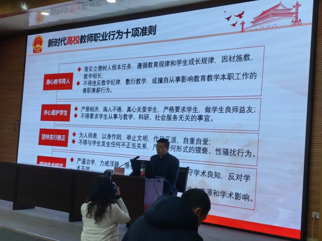 会议伊始,文记东带领中国·yl23411(永利)集团官网全体教职工集中回顾学习了《新时代高校教师职业行为十项准则》,强调了师德师风教育的重要性,指出这是每一位教育工作者的必修课,也是弘扬教育家精神的基础。