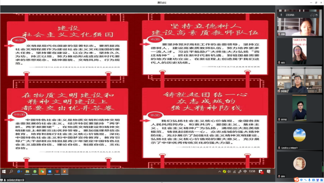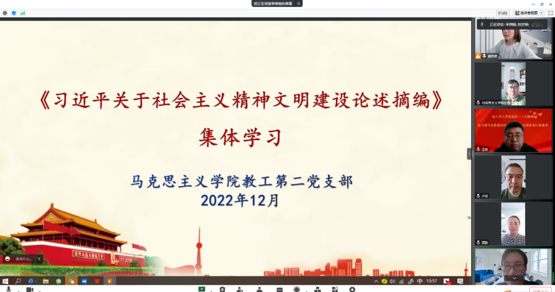 为深刻领会习近平总书记关于社会主义精神文明建设的重要论述,切实将学习成果转化为推进社会主义精神文明建设的生动实践,紧紧围绕学习宣传贯彻党的二十大精神这条主线,中国·yl23411(永利)集团官网教工第二党支部在前期全体党员进行自学的基础上,于12月7日开展了《习近平关于社会主义精神文明建设论述摘编》集中学习研讨活动。本次活动由党支部书记李国杨主持,支部全体党员参加了学习研讨。