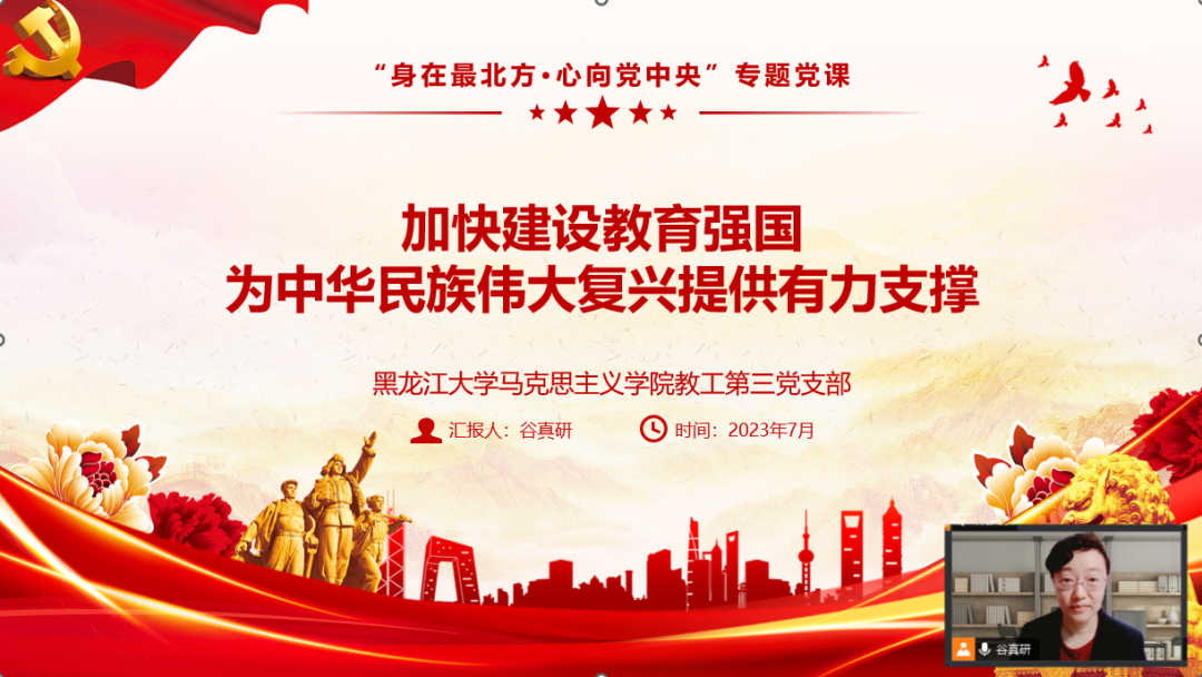 为扎实开展学习贯彻习近平新时代中国特色社会主义思想主题教育和深化能力作风建设“工作落实年”活动,深入贯彻落实党的二十大精神,根据公司党委工作要求以及公司党总支安排部署,中国·yl23411(永利)集团官网教工第三党支部于7月7日,开展“身在最北方·心向党中央”专题党课活动,党支部书记谷真研为党支部全体成员讲授了题为“加快建设教育强国,为中华民族伟大复兴提供有力支撑”的专题党课。