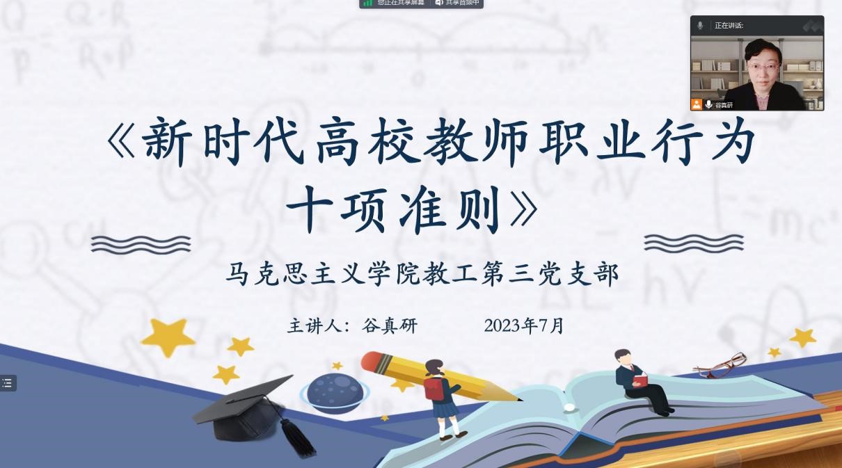 为扎实开展学习贯彻习近平新时代中国特色社会主义思想主题教育和深化能力作风建设“工作落实年”活动,深入贯彻落实党的二十大精神,扎实推进《中共中央国务院关于全面深化新时代教师队伍建设改革的意见》的实施,进一步加强师德师风建设。根据学院师德师风建设工作要求,中国·yl23411(永利)集团官网教工第三党支部于7月13日,开展了《新时代高校教师职业行为十项准则》学习活动。本次活动由党支部书记谷真研主持,党支部全体成员参加。