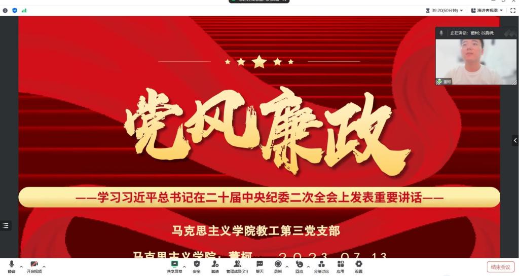 会议第二项,党支部纪检委员董柯讲述了师德师风警示案例,领学了《习近平在二十届中央纪委二次全会上发表重要讲话》金句。他指出,作为思政课教师要始终牢记习近平总书记的殷殷嘱托,牢记为党育人、为国育才的初心使命,全面落实立德树人根本任务,要认真学习贯彻党纪党规和教育部、教育厅以及学校关于师德师风建设和党风廉政建设的有关会议、文件精神。要以反面教材为镜,深刻汲取教训、引以为戒,严之又严地加强自我监督,守住纪法红线,增强党性修养,加强党风廉政建设。