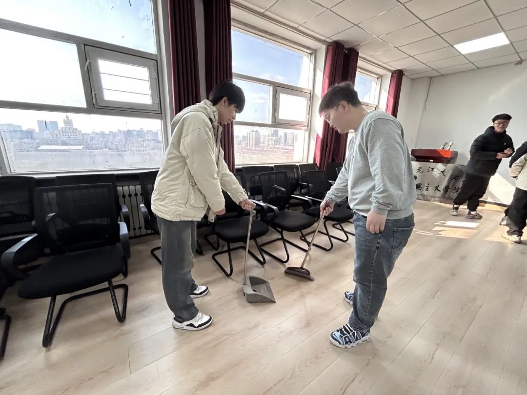 宣讲结束后,机电工程学院2021级员工党支部的同学们积极响应号召,开展了志愿服务活动。同学们分组前往学院办公室、会议室等场所,进行卫生清洁和环境整理。大家分工明确,有的擦拭桌椅,有的整理文件,有的清扫地面,用实际行动践行雷锋精神。